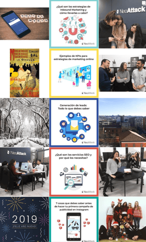 Las columnas de @neoattackagency están divididas por fotos del equipo de la empresa e imágenes con ilustraciones.